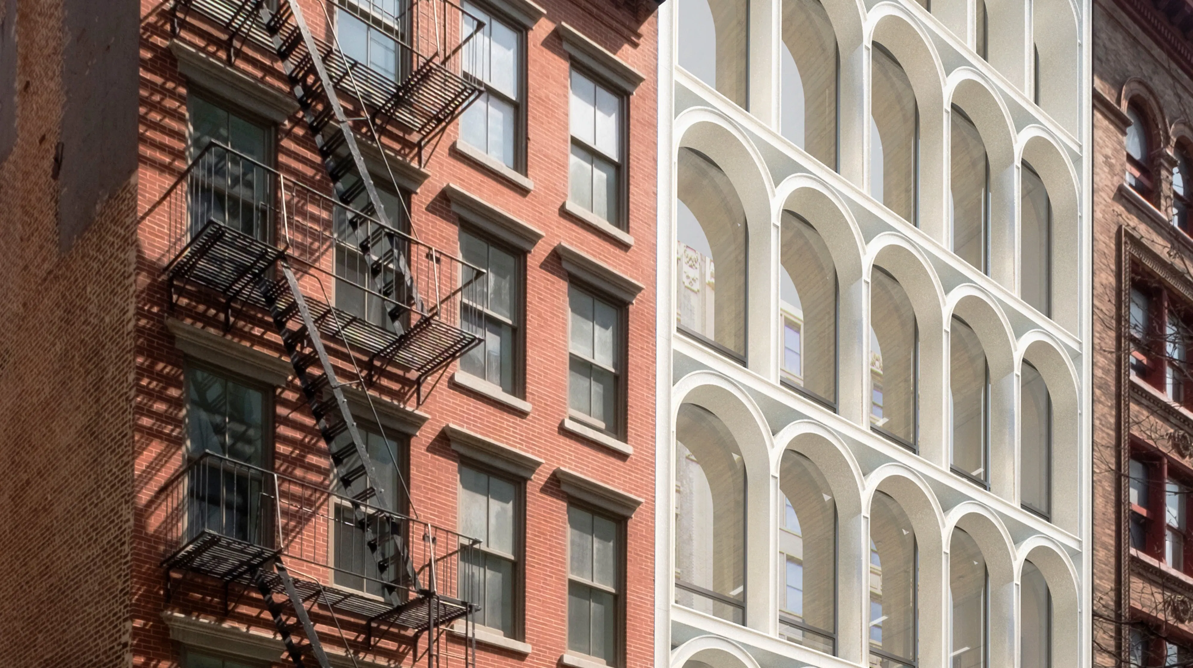 The minimalist arches at 134 Wooster seem to share little with the classically inspired ornamentation found throughout the Soho–Cast Iron Historic District, but the façade has a surprising depth reminiscent of the deep recesses that characterize traditional freestanding cast-iron building fronts.