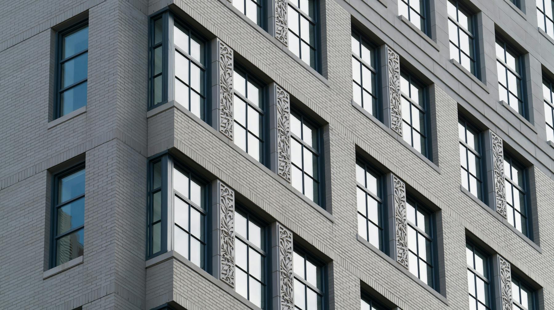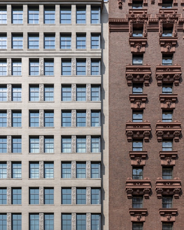 Like many of the classically inspired apartment buildings and hotels on the Upper West Side, such as the adjacent Beaux-Arts-style Hotel Lucerne, 207 West 79th features a tripartite division with a rusticated limestone base and ornate terra-cotta detailing. The wrap-around windows and bold geometric articulation of the base and top, however, evoke the Art Deco towers of nearby Central Park West. These varied influences are unified by a subtle contemporary sensibility evidenced in the building’s restrained ornament: brick soldier courses separating the floors, slightly projecting limestone lintels, and operable six-panel casement windows.