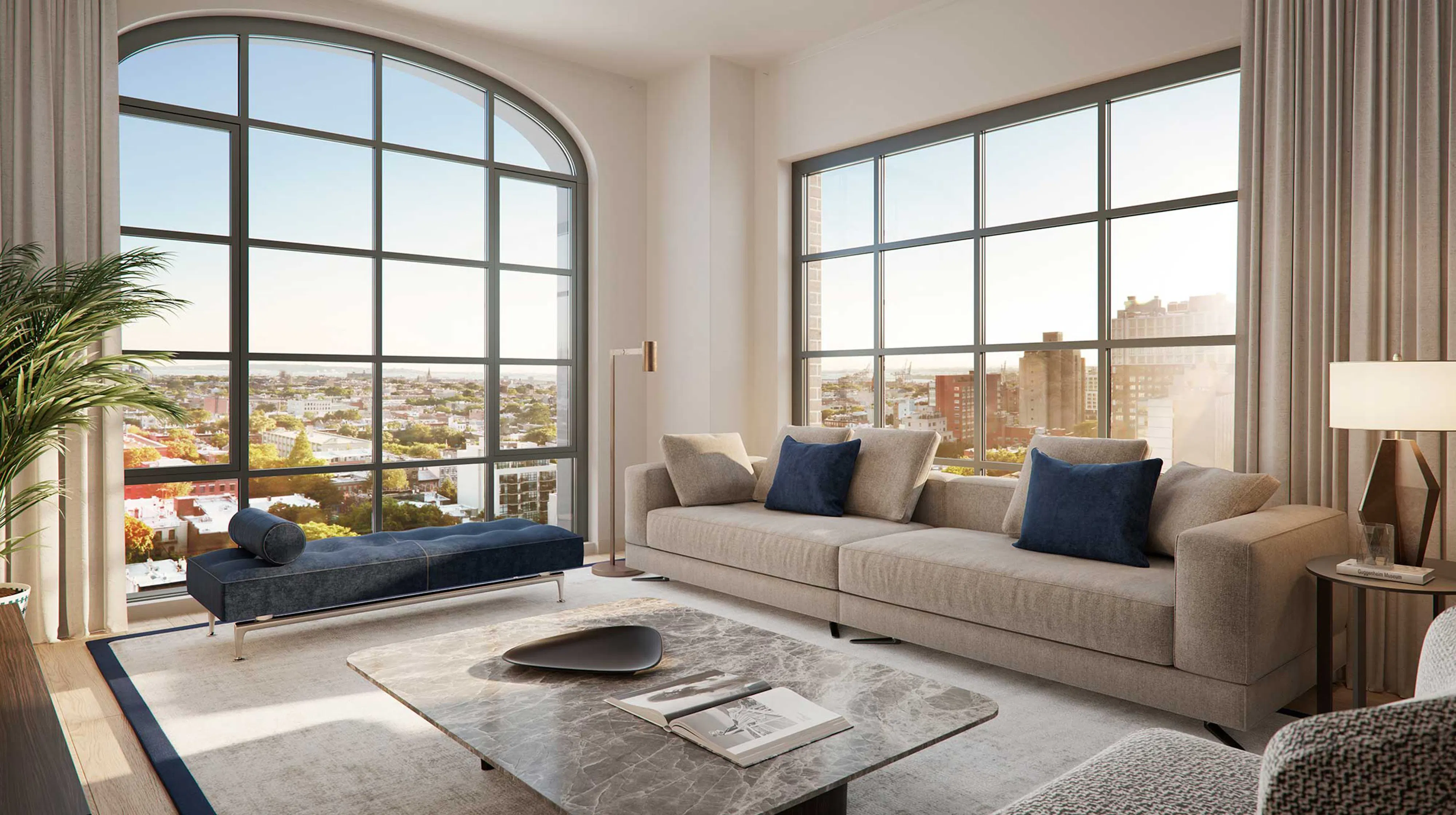This Brooklyn condominium evokes traditional prewar residential buildings with an unadorned limestone and brick façade topped by arched windows and a gently curving cornice.