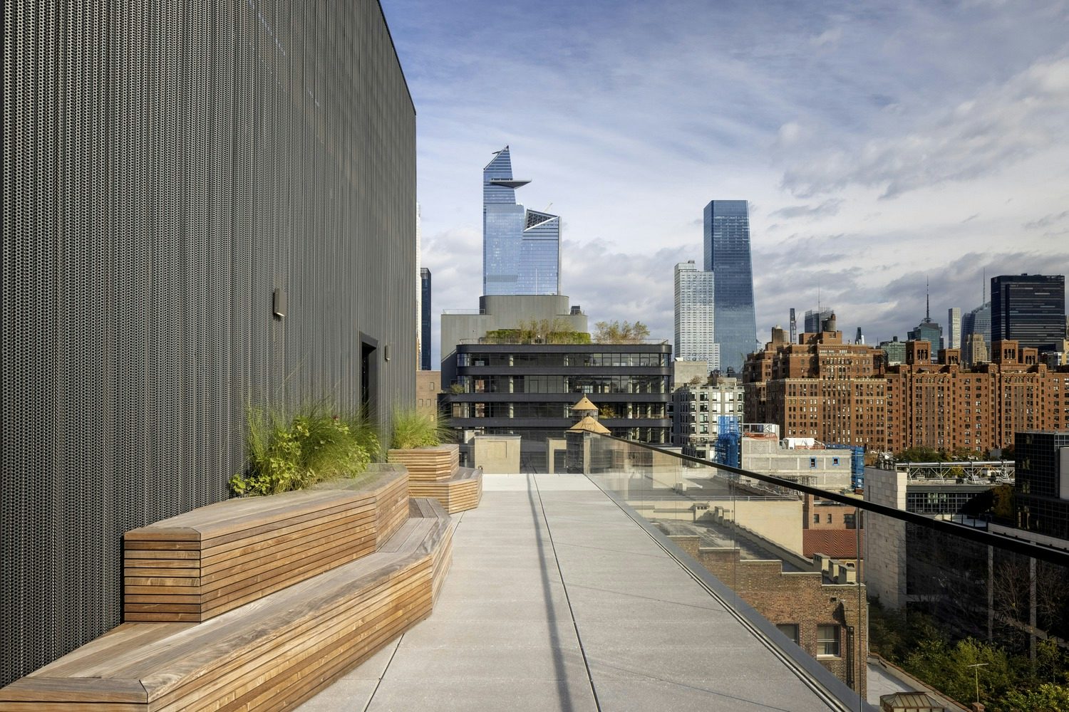 On the roof, the building’s mechanical equipment was incorporated into the design of the landscaped terrace. Perforated metal screens surround the two vertical cores.