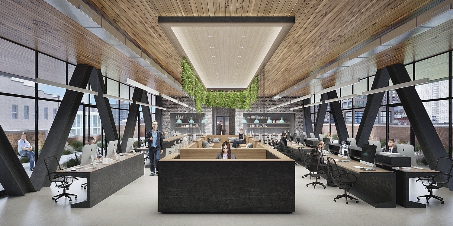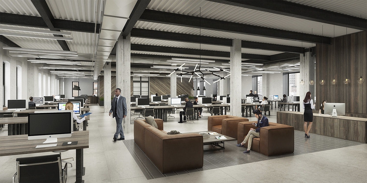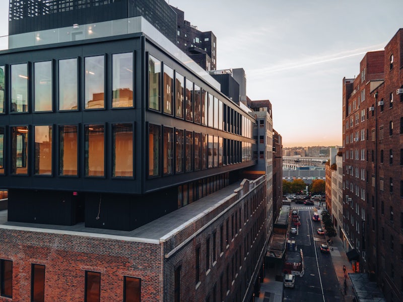 Inside, the generous ceiling heights of the original building remain, as do the original concrete, brick and timber elements that imbue the office space with warmth and historic resonance. These same materials reappear in the new lobby, alongside board-formed concrete walls. A custom reception desk and large feature wall inspired by the work of Carl Andre, built using repurposed railroad ties that recall the nearby High Line, instill in the lobby an artistic sensibility fitting the gallery-dense neighborhood. Also found on the ground floor is neighborhood-oriented gallery space.