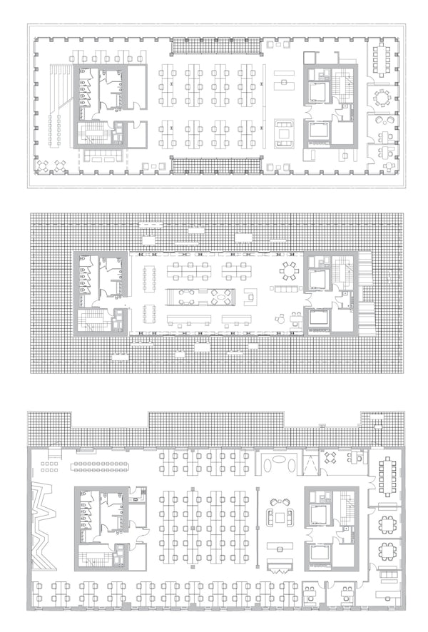Top: Typical plan, floors 6 and 7. In the glass and steel addition, the building’s two vertical cores help structure 520 West 20th Street’s open, flexible office spaces along with housing vertical circulation and mechanical systems. Middle: Floor 5. The single-story glass-enclosed volume between the original building and the bridgelike addition accommodates various uses and features a wraparound, landscaped terrace. Bottom: Floor 2. A typical office arrangement in the original brick building.