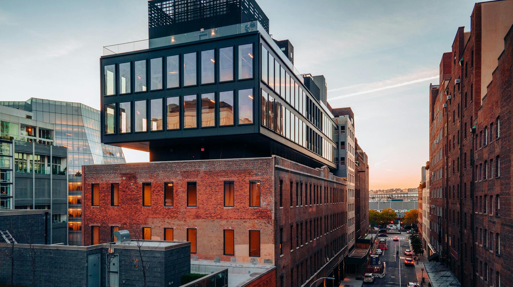 The stark contrast between the building’s two primary components is reinforced by the cantilever of the addition, which appears to float above the warehouse. The glass and steel overbuild offers contemporary, minimal office spaces that contrast with the warmer spaces inside the preserved warehouse.