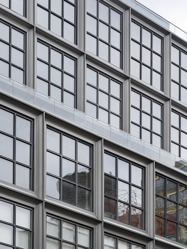 Rising on the site of a former parking lot, the design pays homage to the warehouses of the neighborhood’s past with a façade of large factory-sash windows set in a bead-blasted recessed aluminum grid that gives the rigorous geometric fascia a sense of depth.