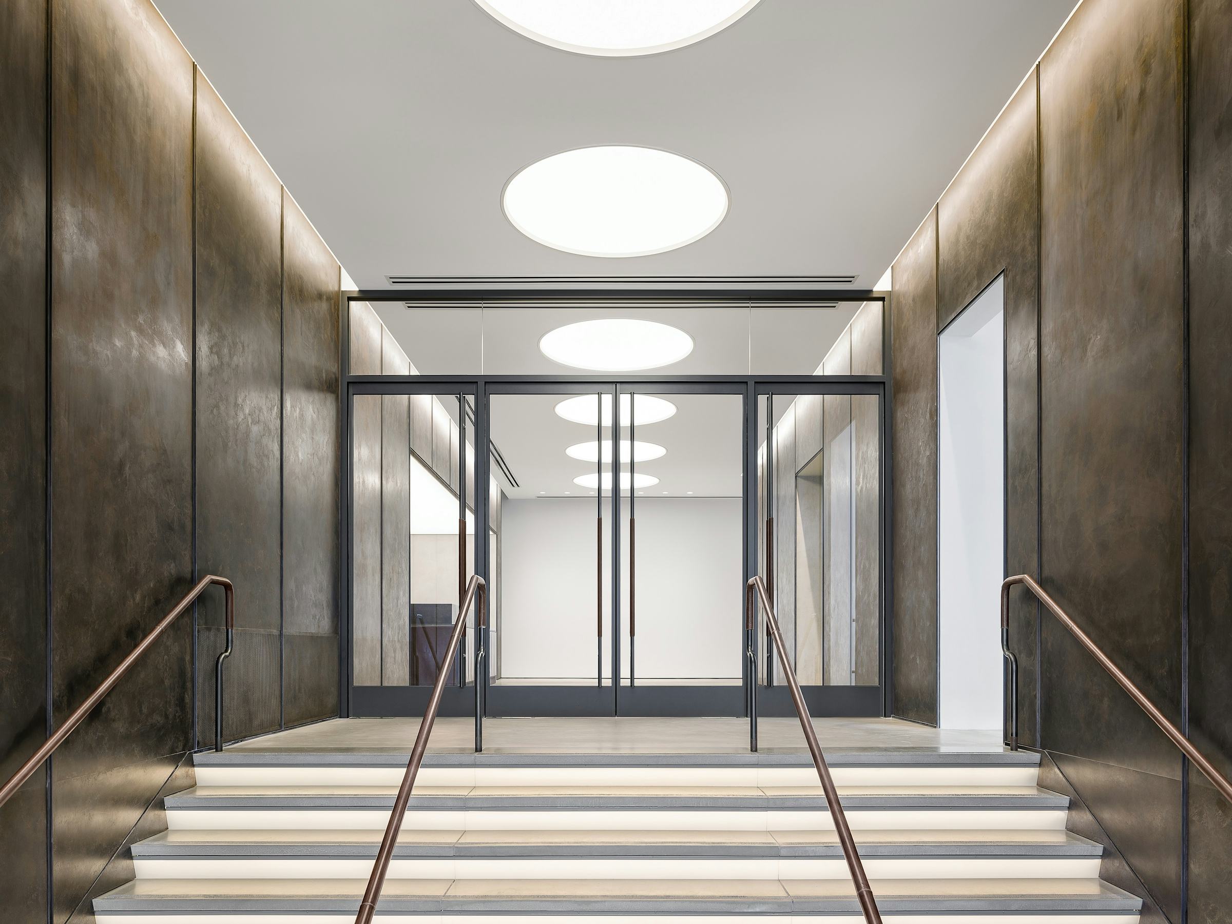 The building’s lower levels are specifically designed for gallery and exhibition space, offering curators versatile, well-lit rooms. The office spaces above are similarly flexible, with generous floor plans, and natural light that penetrates deep into the building.