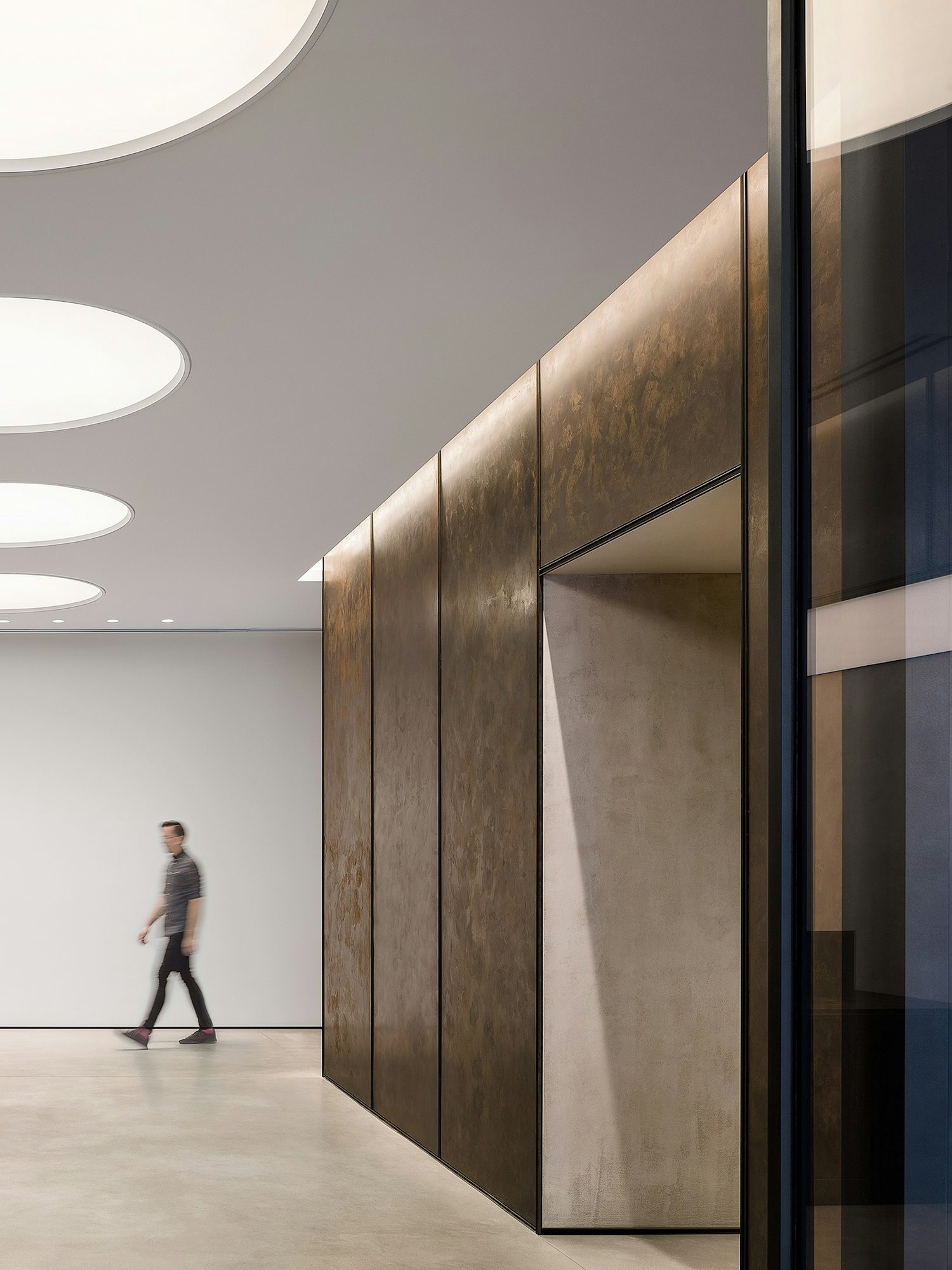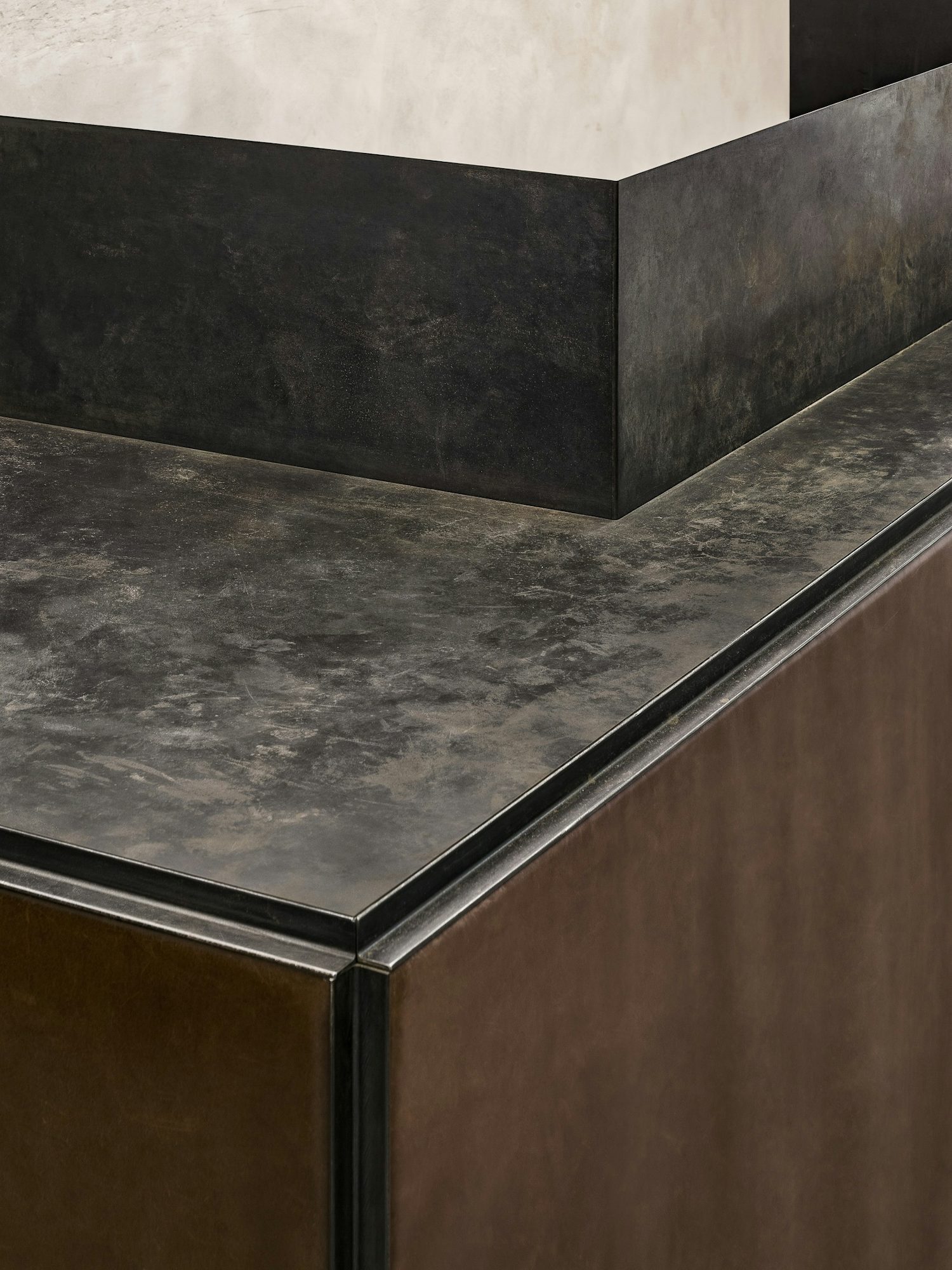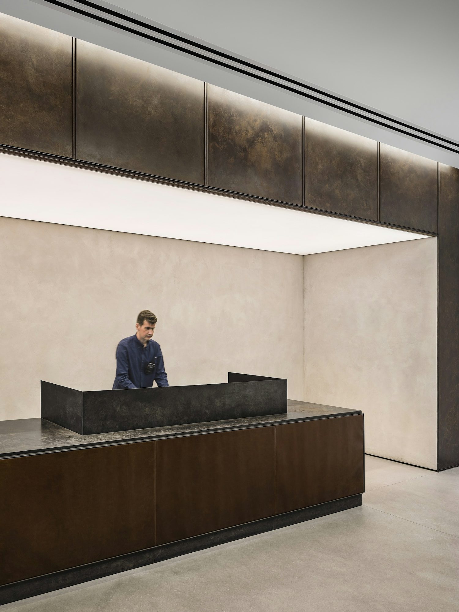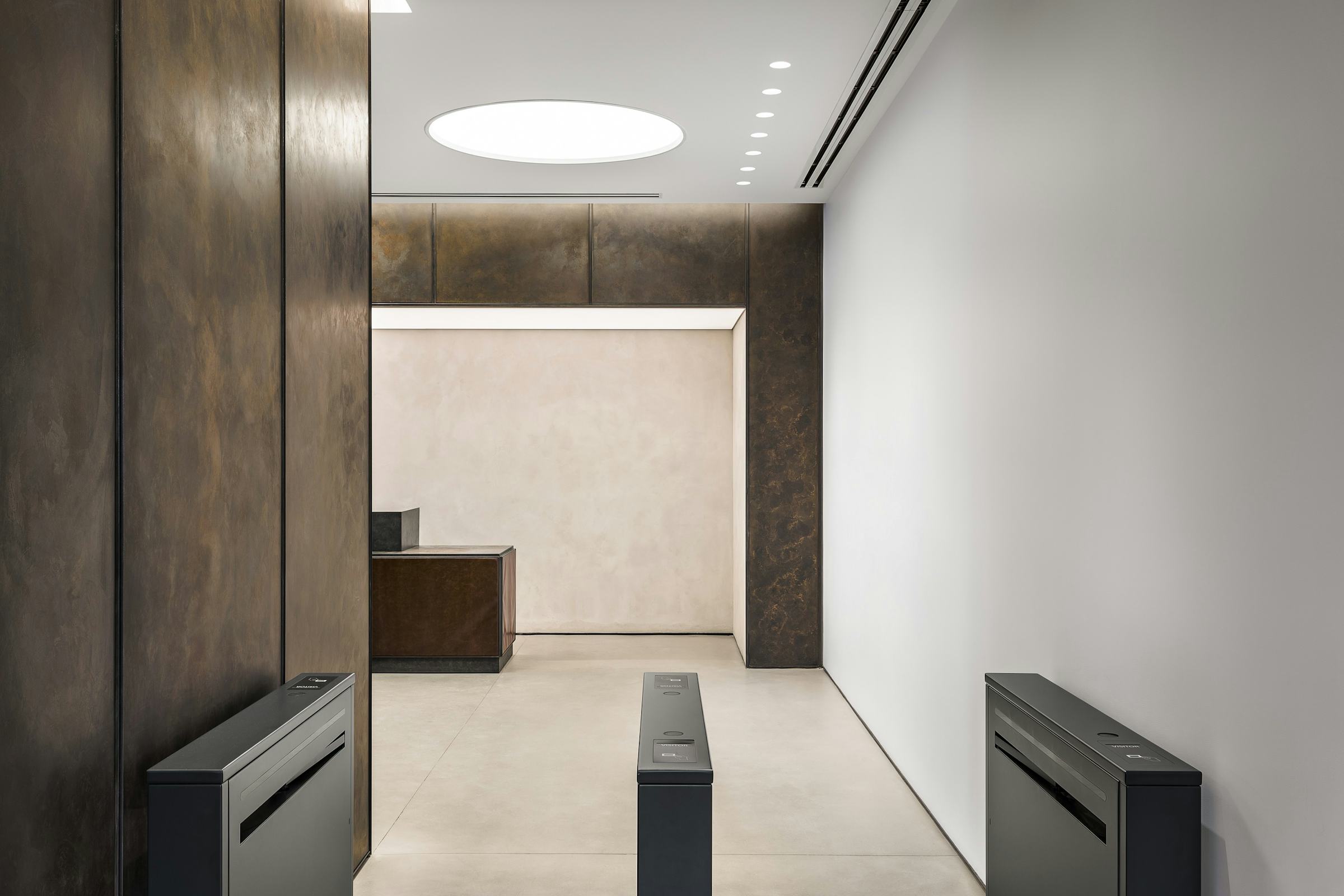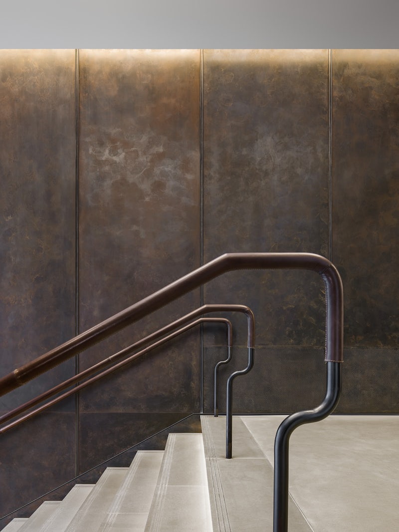 A restrained palette of patinaed steel, finished concrete, and handstitched leather reflects Chelsea’s post-industrial character while adding texture to 540 West 26th Street’s refined spaces.