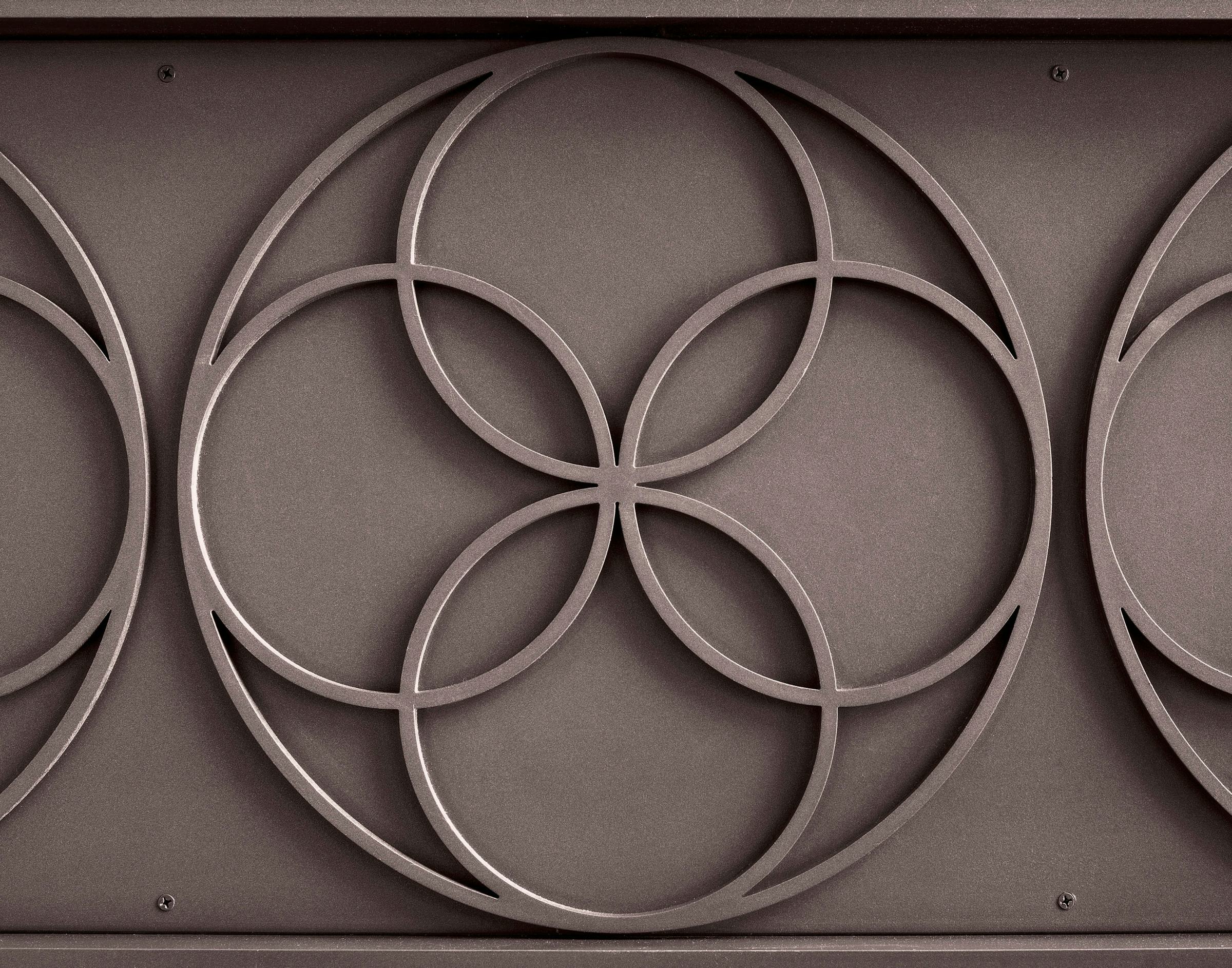 Handmade bricks give the 17th Street façade a sense of craftsmanship that contrasts with the much more precise grid of oversized single-pane windows. A pattern of overlapping circles surrounds the building’s metal-clad base.