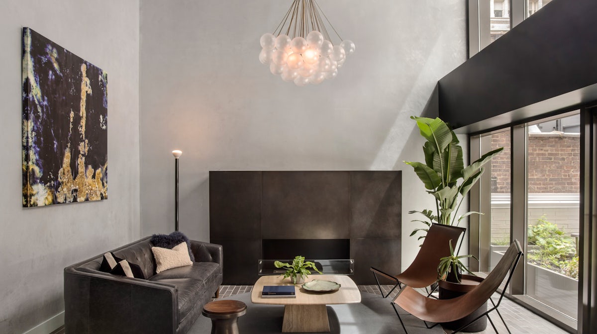 Notable elements of 55 West 17th Street’s double-height residential lounge include plaster walls, access to the central courtyard, and custom concrete pavers that match the proportions of the exterior brick cladding. A spiral stair finished in walnut leads up to a small screening room.