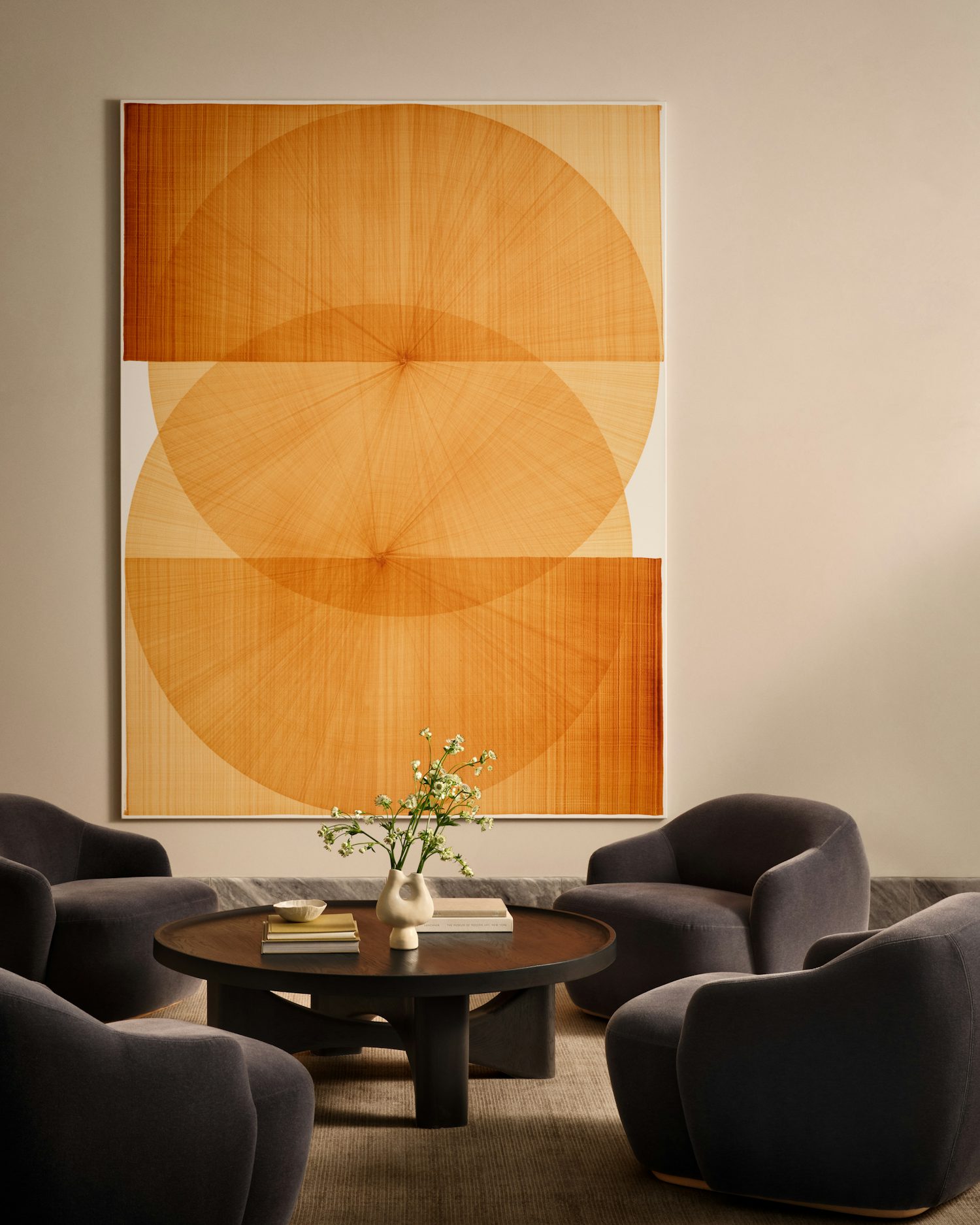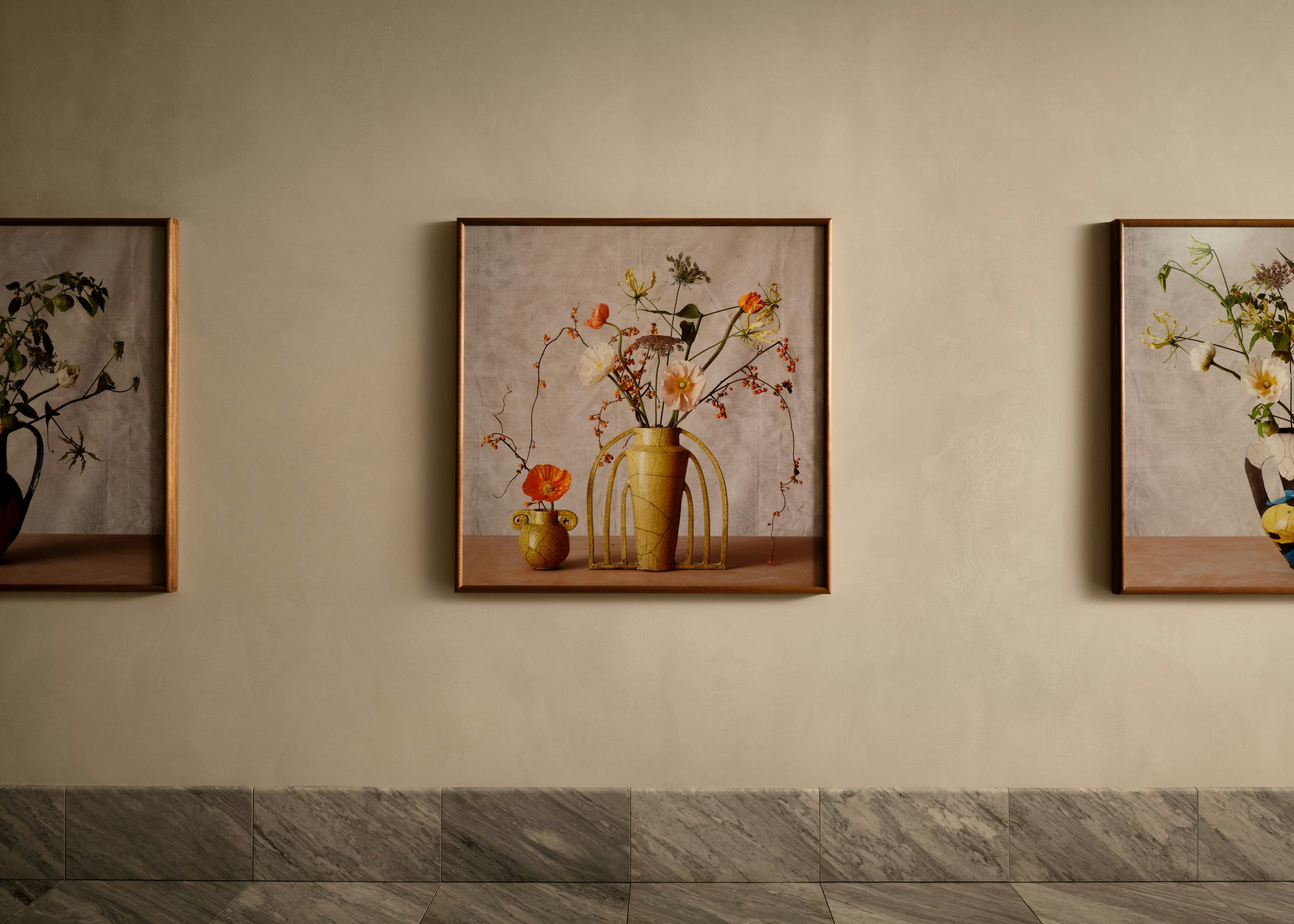 In a quieter, more intimate seating area near the rear lobby, three large-format photographs by Emily Mullin — known primarily for her ceramic work — offer a contemporary take on the still life. Produced with Griffin Editions in Brooklyn, Mullin’s images were dye-sublimated directly onto metal panels, eliminating the need for glass and emphasizing material clarity.