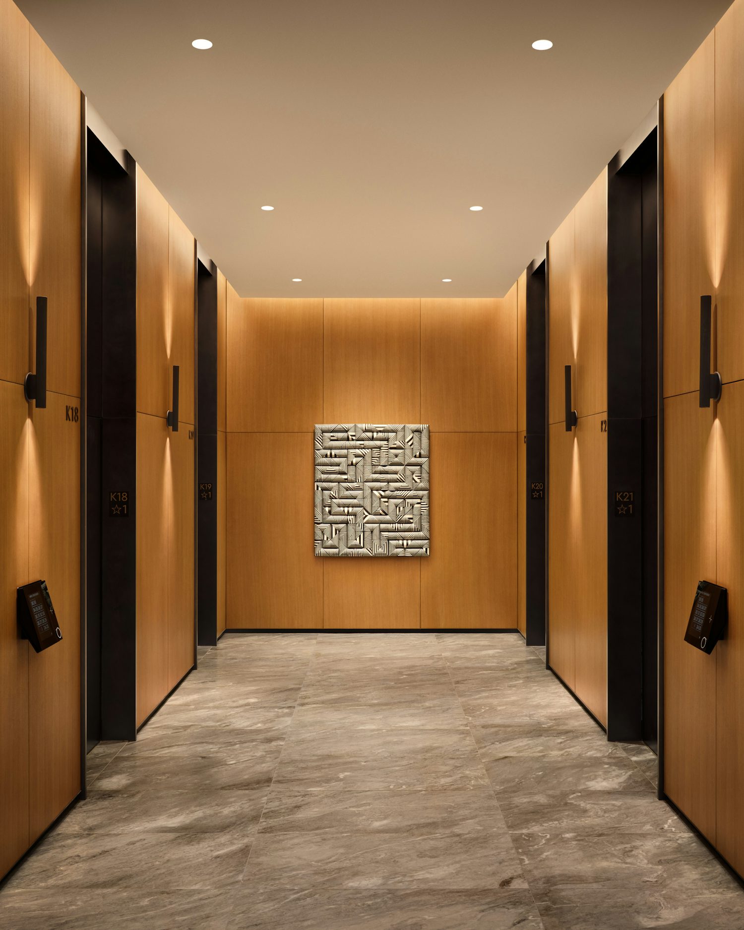 Further along the lobby’s central axis, a freestanding sculpture by Brooklyn-based artist Guy Corriero introduces an architectural presence in the round, while Indianapolis-based ceramicist Jackie Head’s unglazed black-and-white porcelain wall sculpture brings texture and tactility that draws the eye to the oak-clad elevator vestibule. The space also features a full wall mural by noted textile artist Liz Collins, produced as a custom wallcovering by Brooklyn-based Flavor Paper. Corriero also worked with MA to create the hand-sculpted plaster columns found throughout the lobby.