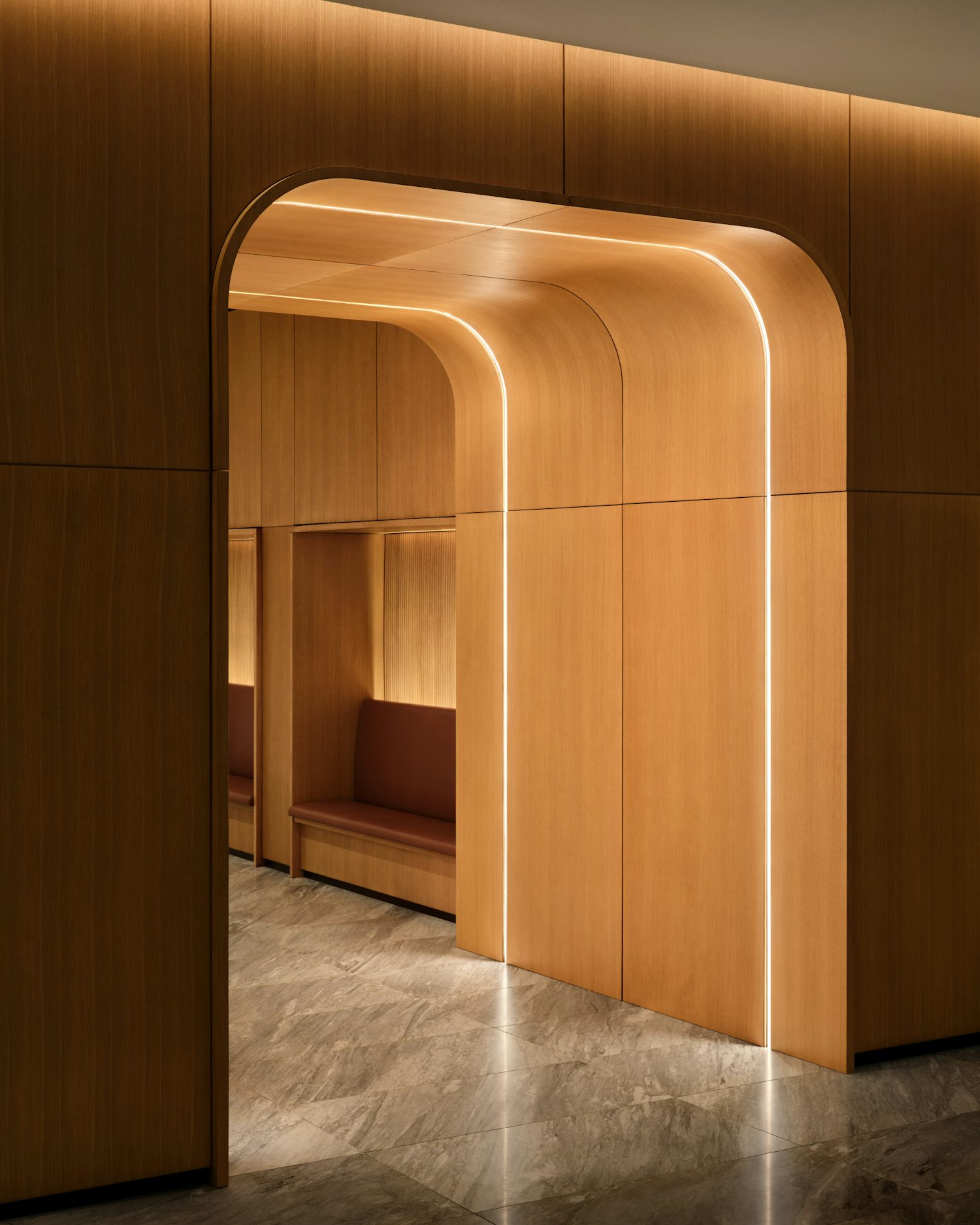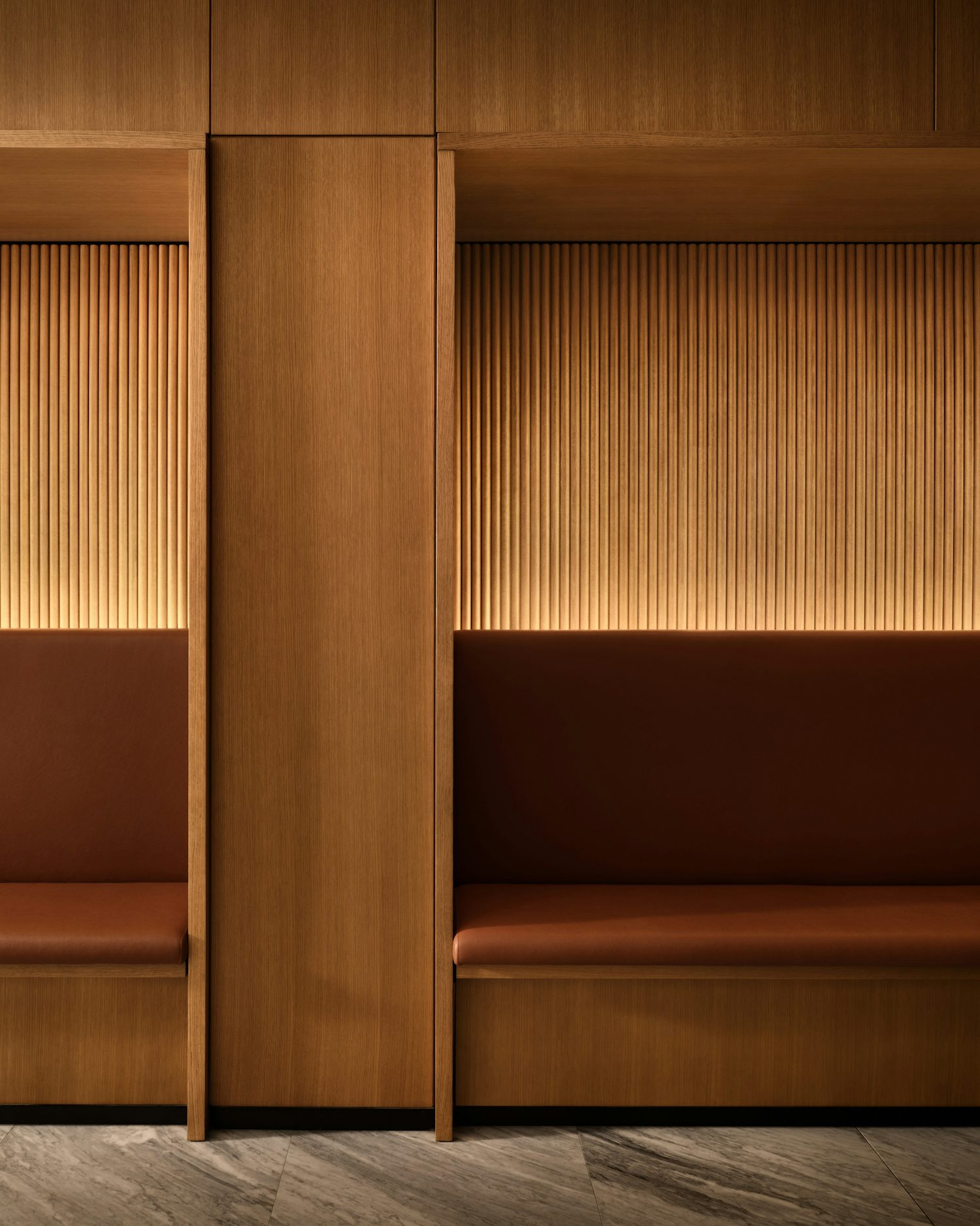 MA was recently retained to design a new lobby experience within 60 Broad—the 39-story, circa 1963 office tower that houses the firm's design practice. The renovation replaced dark wood walls and green marble paneling with gray stone floors and white plaster walls. Other updates include an intimate seating area near the front of the lobby, a new reception desk made of fluted oak and antique brass, light wood paneling along the back wall and the elevator lobby, and recessed ceilings that mimic skylights.