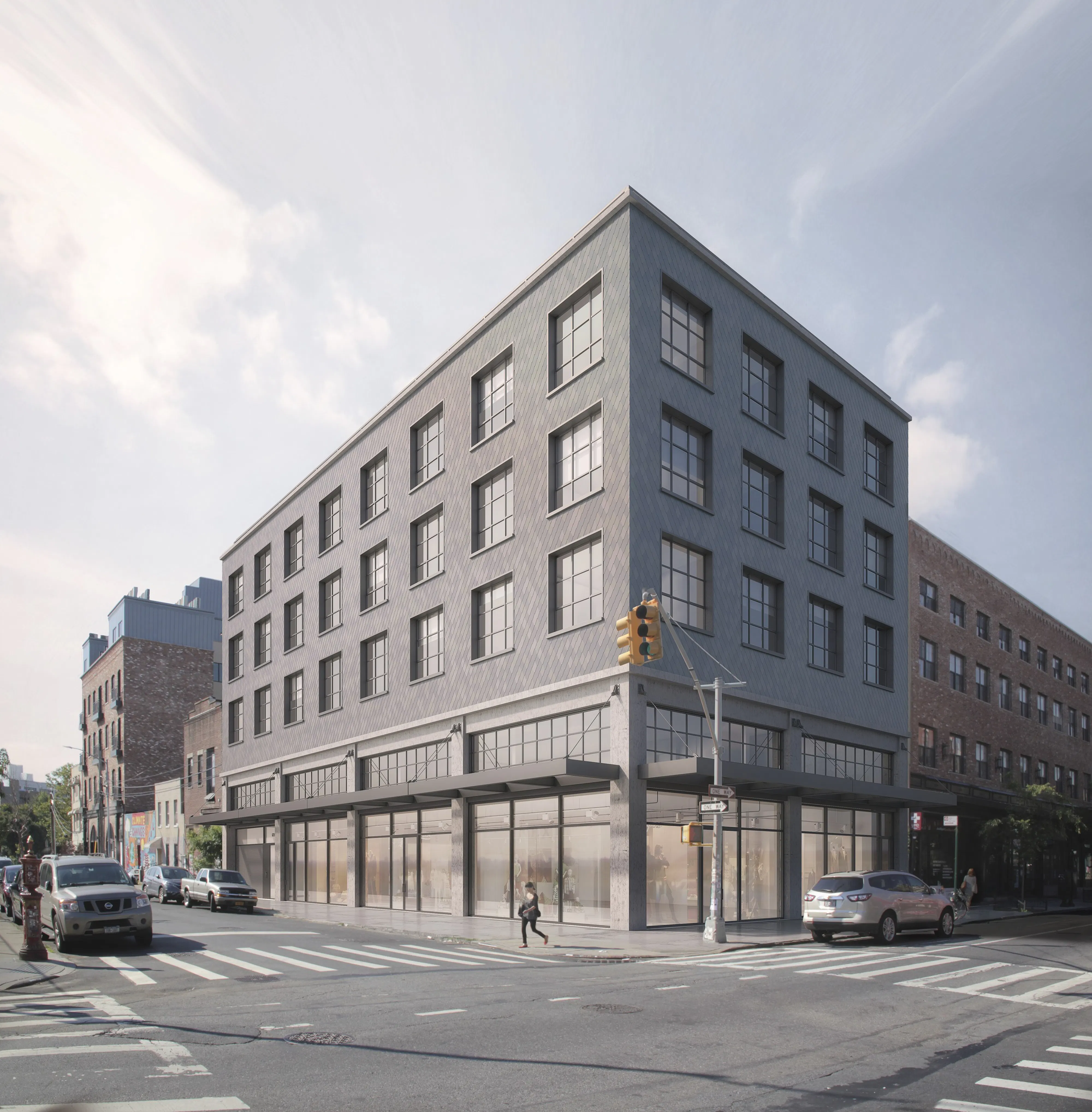 This new corner building features distinctive textured cladding and an industrial style that reflects the Williamsburg neighborhood. The project was designed and constructed concurrently with its complementary "sister structure" located one block away at 658 Driggs.