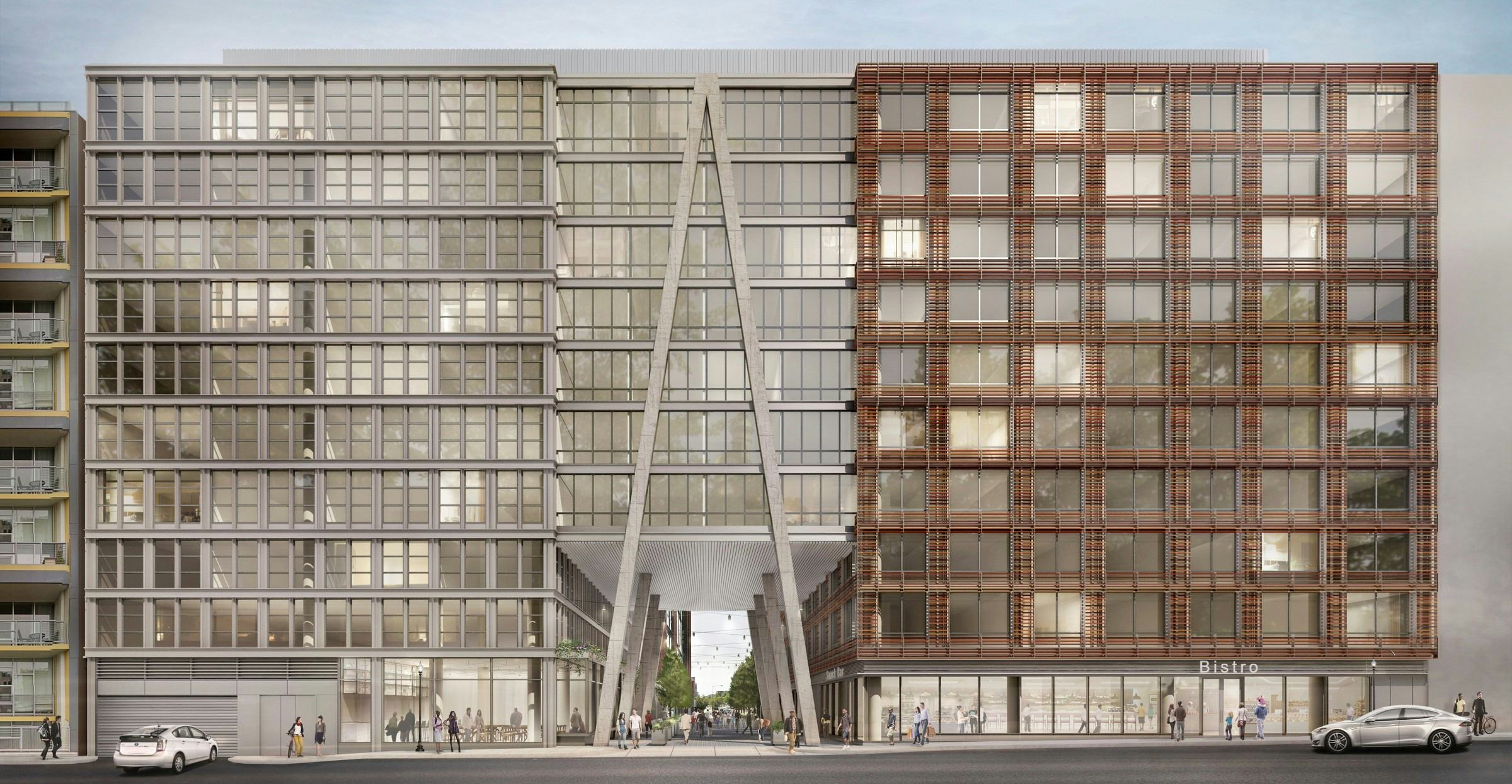 The concrete supports of the skybridge angle down to the street, offering both an architectural focal point in the newly created space and a gateway to the project from the east. The street itself, which restores a connection through the block that was removed long ago, is lined on both sides with new retail spaces.
