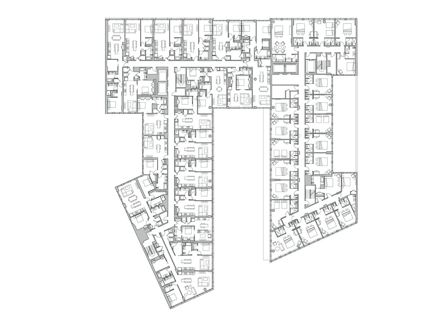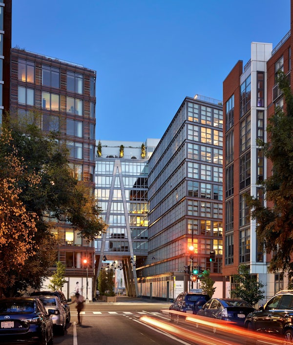 On floors four through nine, the apartments continue into the glass and concrete skybridge that spans a new internal street—inspired by the Dutch woonerf, or “living street.” The skybridge connects the rental building to the structure on the south side of the site, a unique rental building that is home to Whyle, a new short-stay furnished apartment concept.