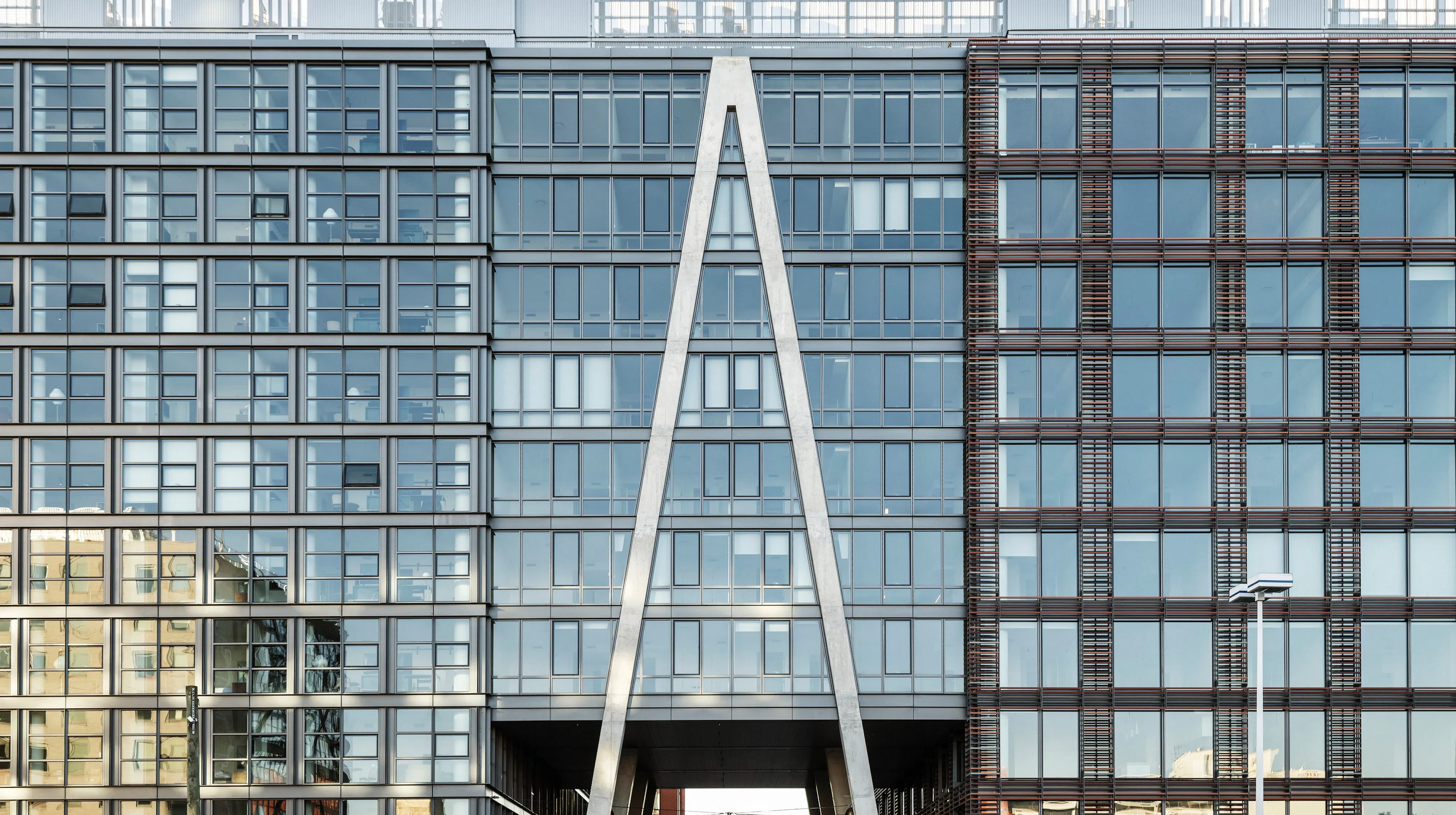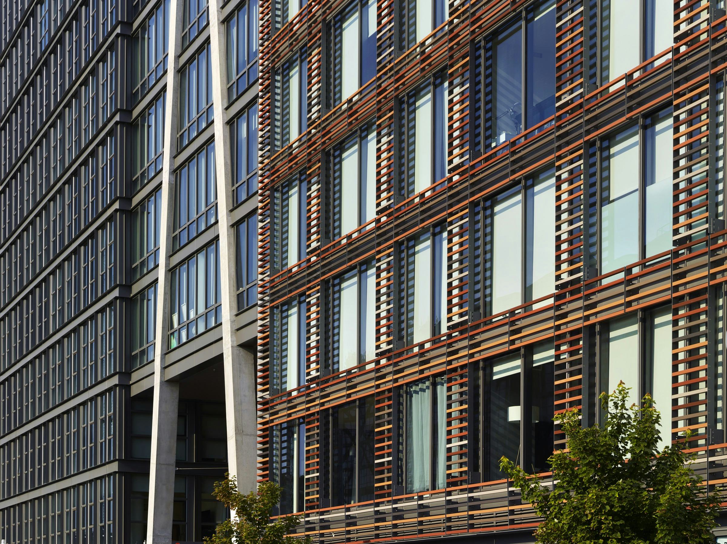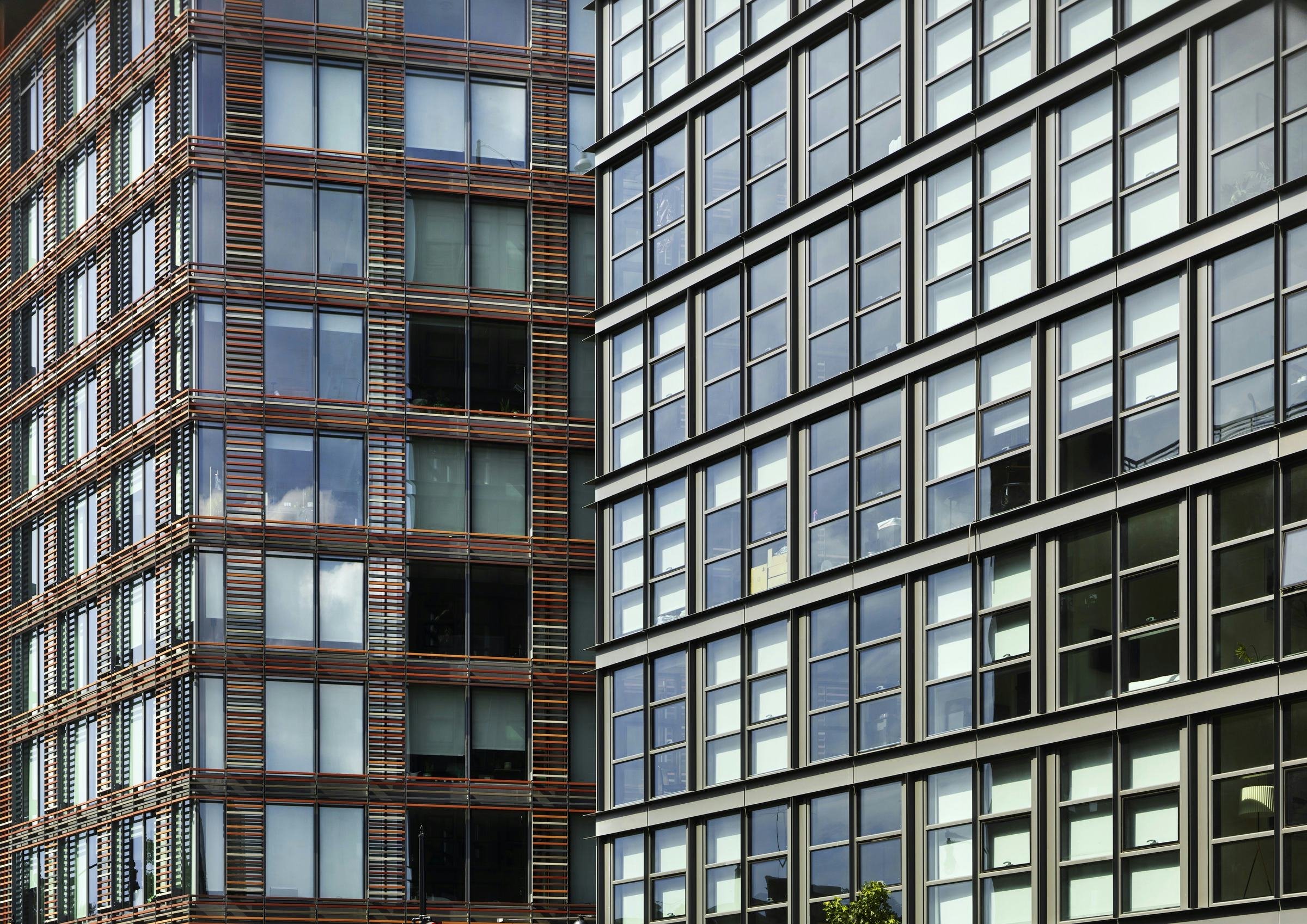 On the north side of the site, a glass rental building is wrapped in a screen of multicolored terra-cotta baguettes. The screen’s depth and warm colors recall older masonry structures—an effect reinforced by the regular openings that evoke punched windows in a masonry façade. Inside, a similar effect is achieved with walnut, brass, and leather finishes that give the building’s refined public spaces a historic resonance.