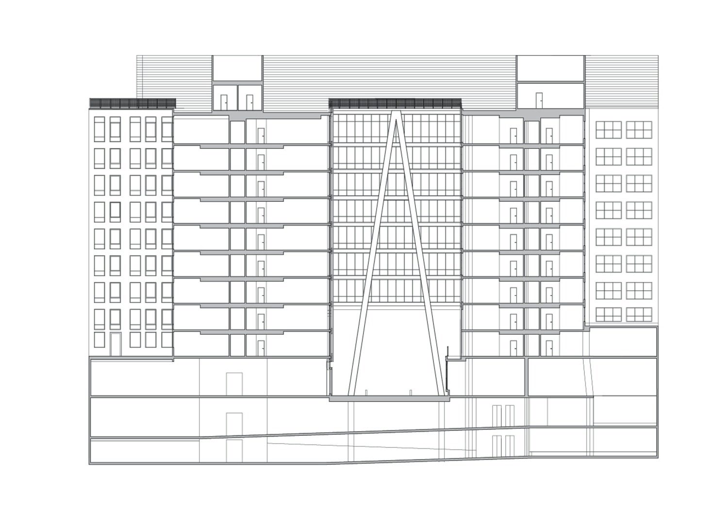 Left: Site section. 901W’s two buildings are connected by shared underground parking and by a seven-story glass skybridge. Right: Typical plan, floors 4–9.