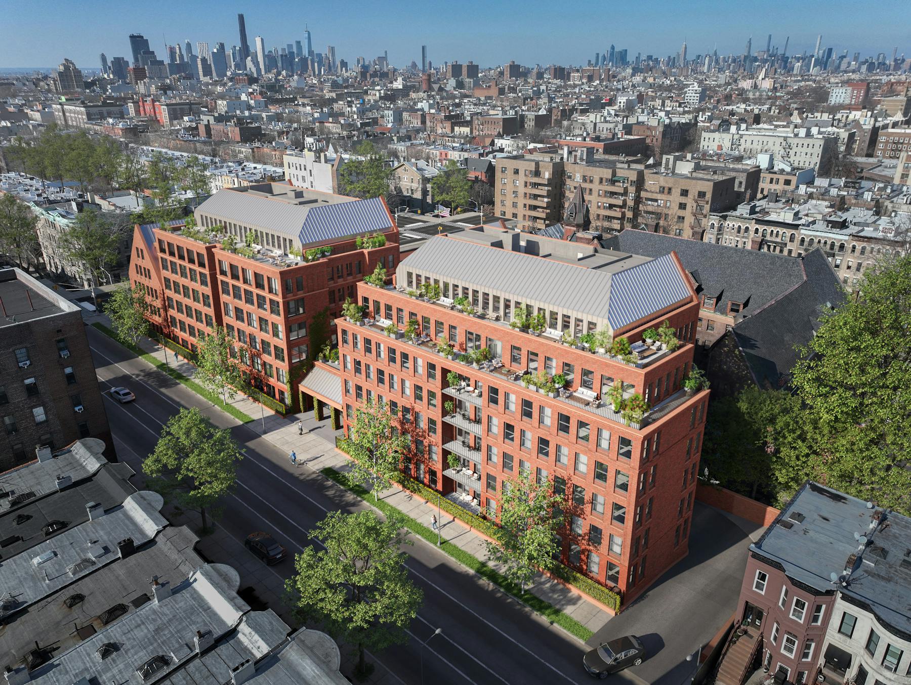 To design a large-scale building that both stands out and fits in, Mason Gray is composed of a variety of volumes and roof forms, each coming together to pay homage to unique aspects of the neighborhood’s historic fabric. In particular, Mason Gray’s massing was informed by the pitched rooflines of the adjacent Hebron Seventh Day Adventist Church and School. Known as the “crown jewel” of Crown Heights, the building was completed in 1889 and designated a New York City Landmark in 2011. The New York City Landmarks Preservation Commission (LPC) also influenced the building’s size and shape by requiring the visibility of surrounding historical facades to be maintained throughout the site.