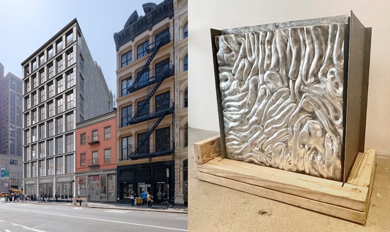 On an emotional level, van Arkel’s work exemplifies MA Art’s three-fold mission: to keep the environment fresh, to inspire people, and to connect artists with clients and collectors. His solo exhibition at the MA office in 2016 led to a client acquiring work of his for the lobby of the Williams, shown below. Additionally, MA subsequently facilitated a commission for van Arkel to create a mural for the firm’s Atlantic Plumbing Building in Washington, D.C., and casts of his work will be used to create the zinc-clad façade of an upcoming MA project located at 419 Broadway, also shown below.