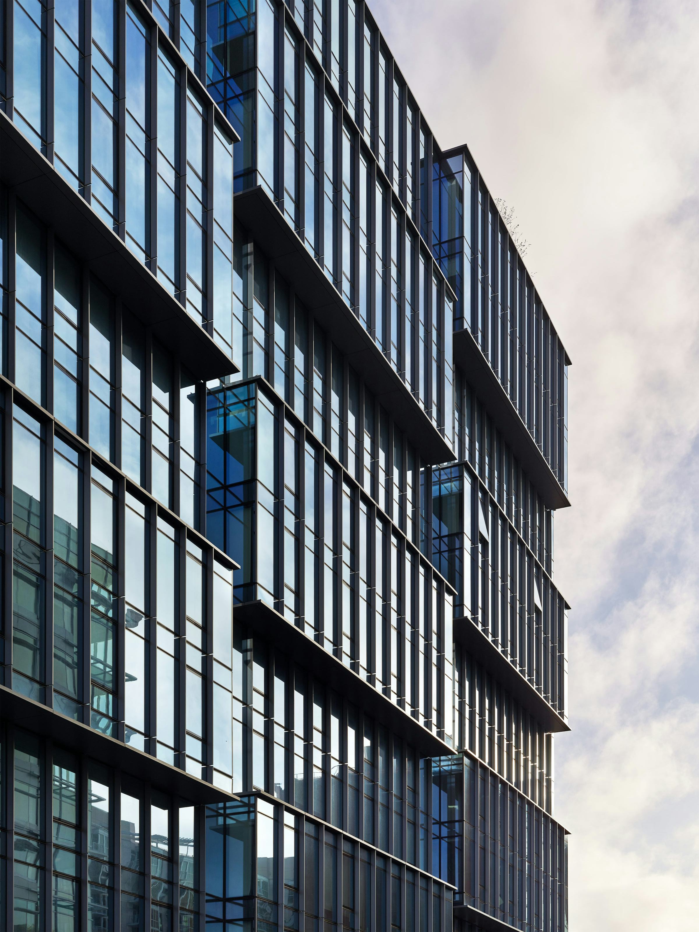 The building’s deceptively simple appearance belies its highly technical execution. Its façade functions as a window wall along the slabs at the top and bottom of each projection and like a curtain wall installed in front of the slabs between. Sections of the assembly are built from a carefully selected spandrel glass used to conceal One Hill South’s concrete structure and mechanical systems.