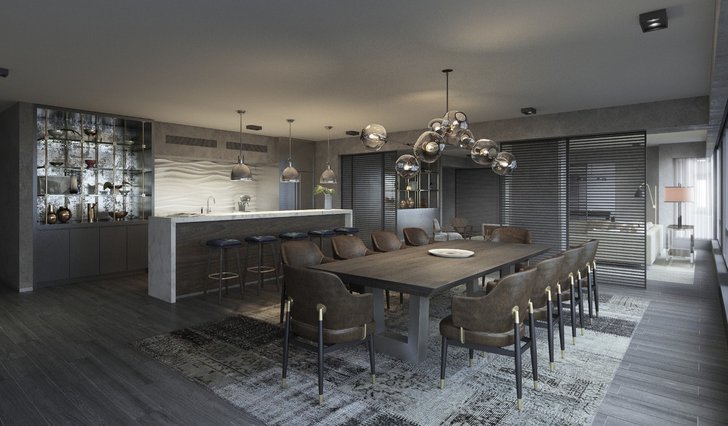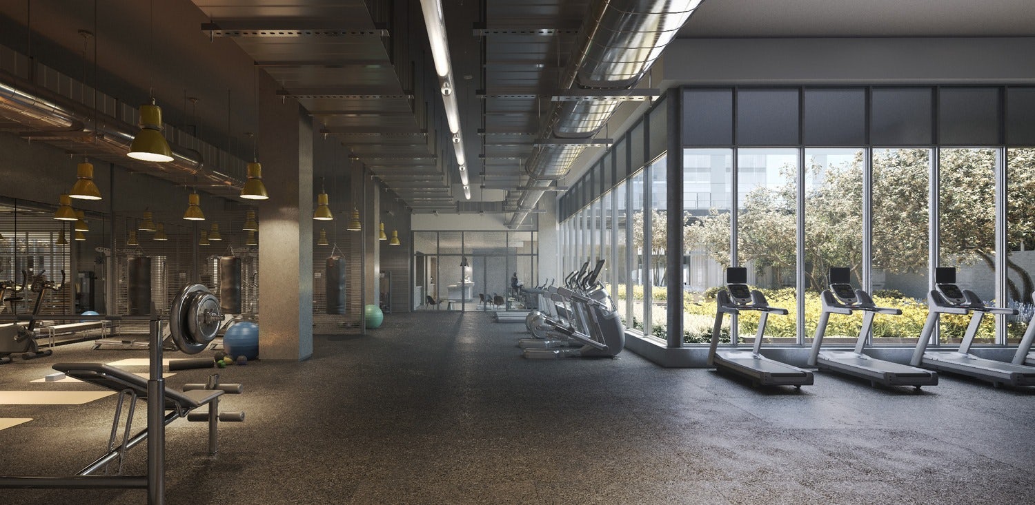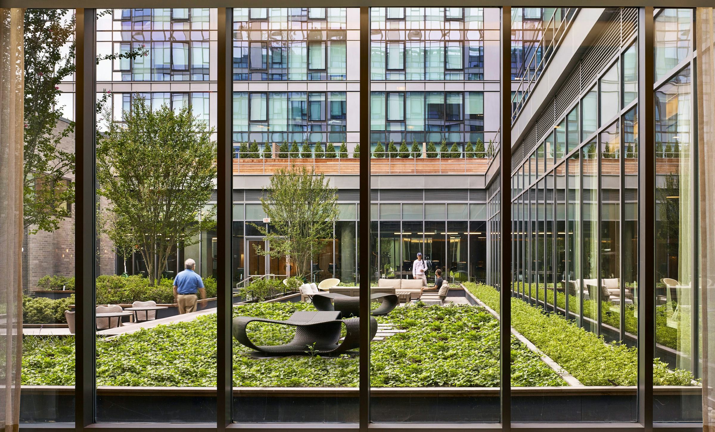 Each unit features open floor plans and luxurious finishes, including oak floors, walnut cabinetry, and marble surfaces. Resident amenities include a fitness center and private lounges with views onto the courtyard, as well as a large landscaped roof terrace featuring a swimming pool and outdoor dining areas.
