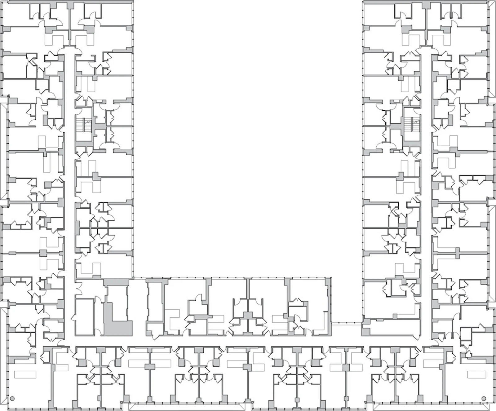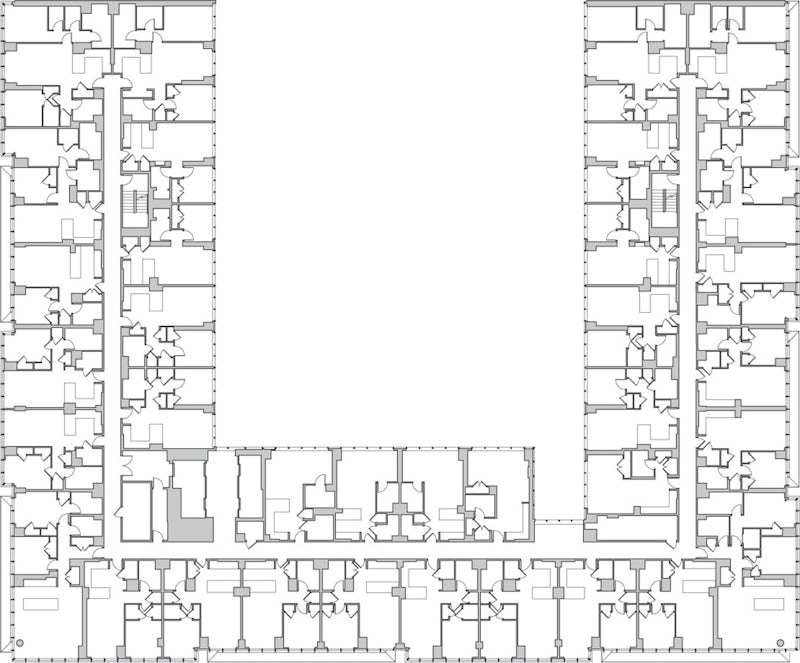 One Hill South's staggered projections create pairs of alternating floor plates, which provide a greater number of options for tenants interested in one of the 383 studios, one-, two-, and three-bedroom apartments arranged around the building’s central courtyard.