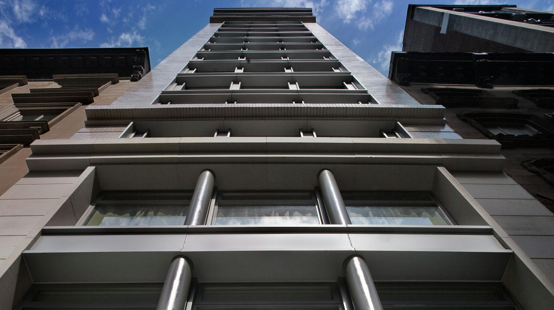 The limestone base, glazed gray brick, and zinc detailing that define this luxury multifamily building were inspired by the white neoclassical facades found throughout the Ladies’ Mile Historic District.